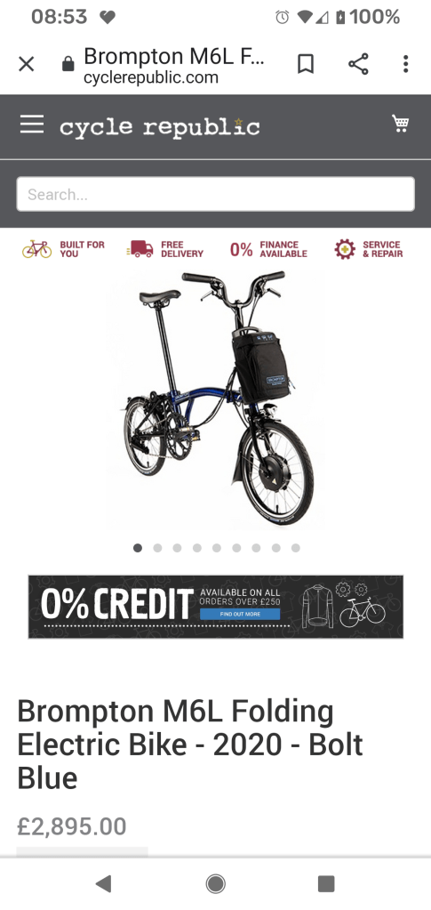 Today I picked up something I’ve been coveting for absolutely ages. An electric Brompton in a metallic blue. It was a strange process. Not too go into too much detail I bought this the day before Boris closed all three shops and having paid the best part of £3000 I couldn’t collect it!!! How frustrating was that dear reader…